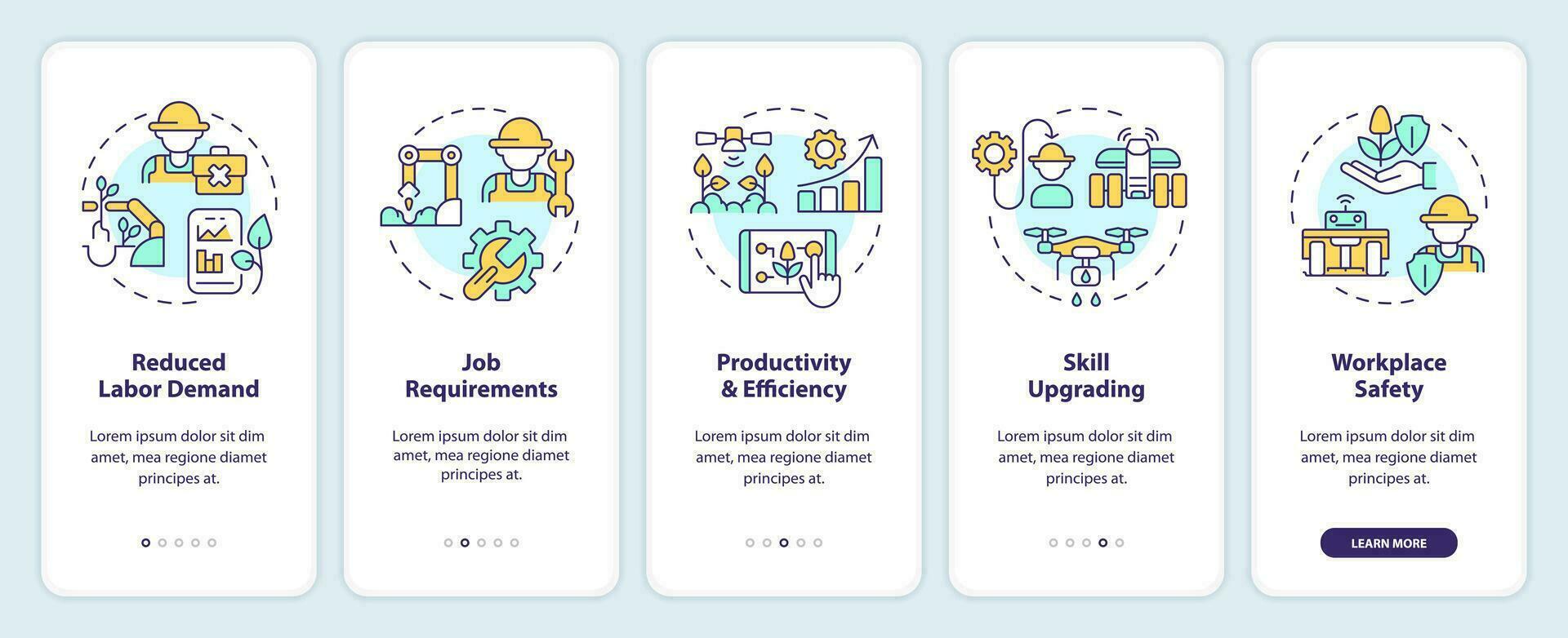 Labor impacts of agricultural automation onboarding mobile app screen. Walkthrough 5 steps editable graphic instructions with linear concepts. UI, UX, GUI template Pro Vector