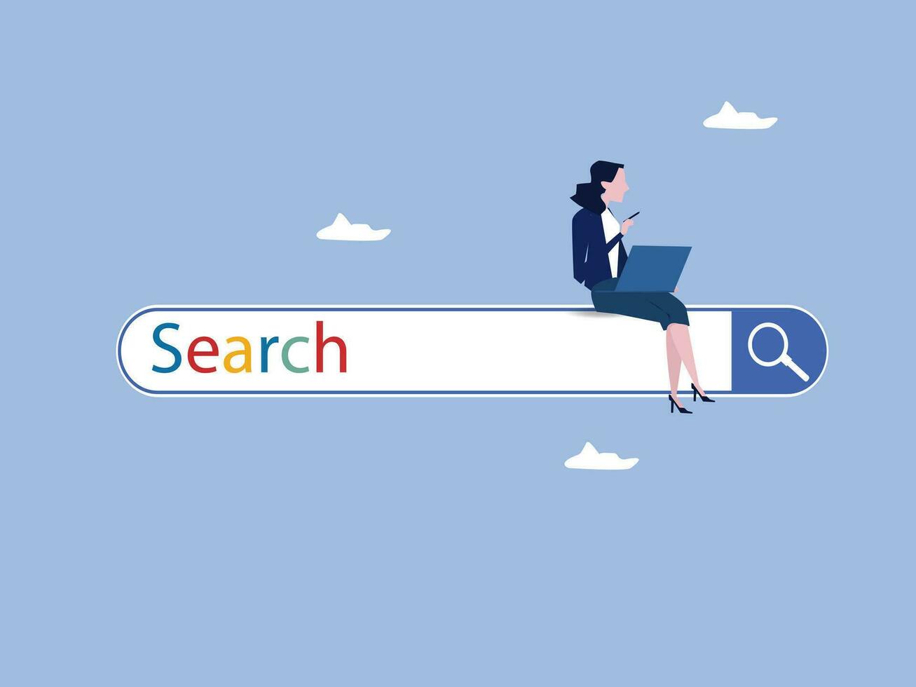 Search box, SEO search engine optimization or finding website from internet, online job or career opportunity concept, woman working with computer laptop on search box with magnifying glass button. Pro Vector