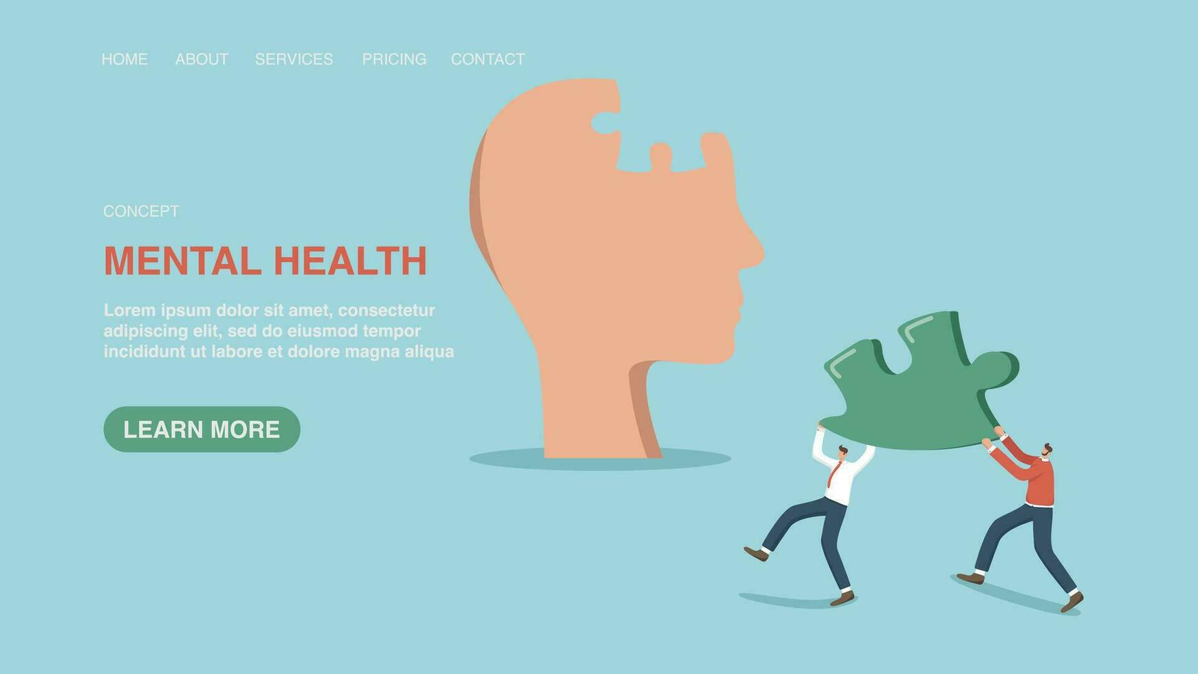 Web banner, infographic, web page with men carry the missing puzzle to a big head. Mental health, ways and creative approach to solving complex problems, brainstorming to achieve high results in work. Pro Vector