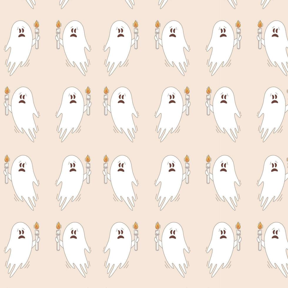 Halloween vector pattern. Flying scared ghost with candle in retro style. Pro Vector