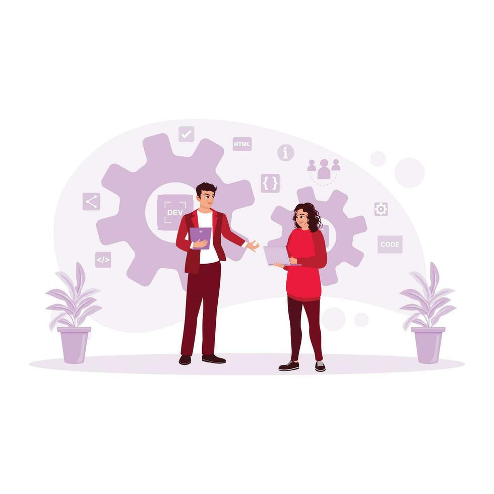 Two professional IT experts are developing software with digital tablets and laptops. Coexist with agile software. DevOps Developers concept. Trend Modern vector flat illustration Pro Vector