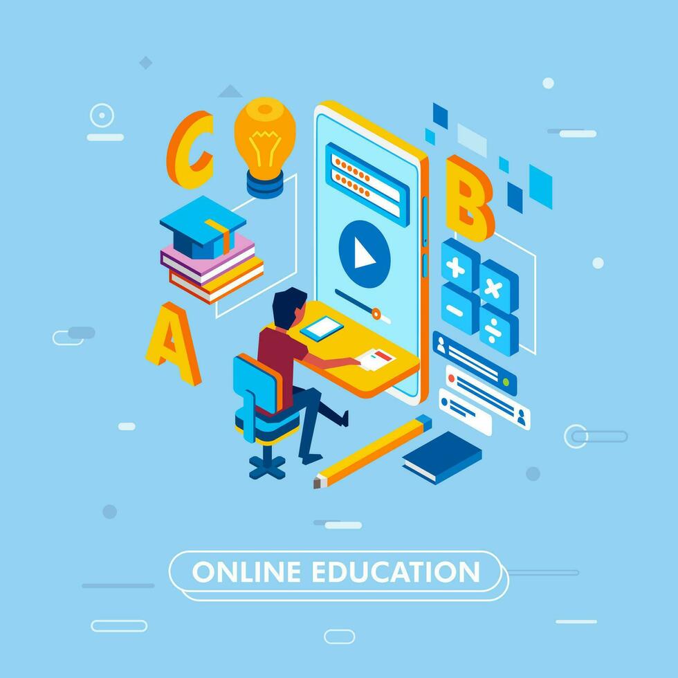 modern concept of online education with digital based can be access from smartphone, man character and education element isometric 3D vector illustration Pro Vector