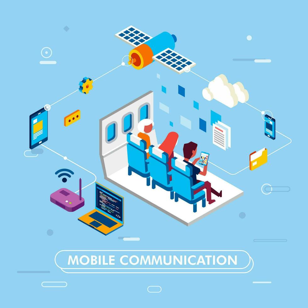 modern isometric design of mobile communication with internet networking, people sit on airplane seat and browsing with tablet vector illustation Pro Vector