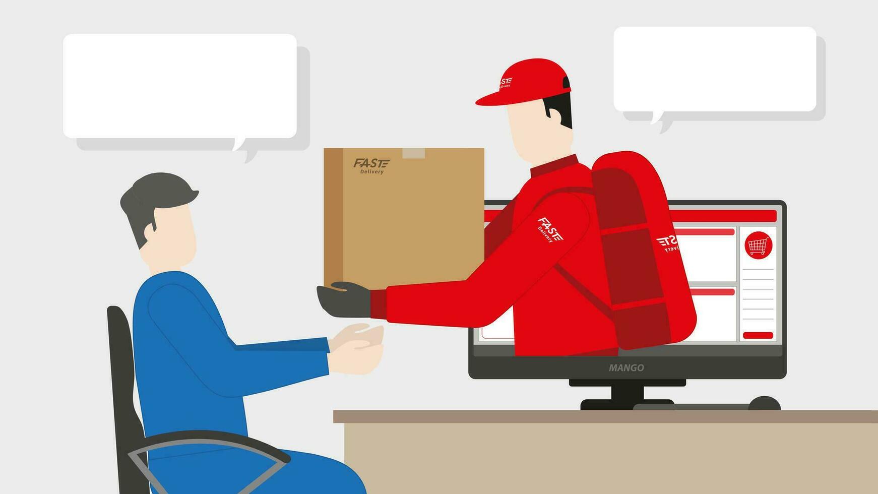 Fast delivery concept. Delivery man and parcel box get through computer screen. Pro Vector