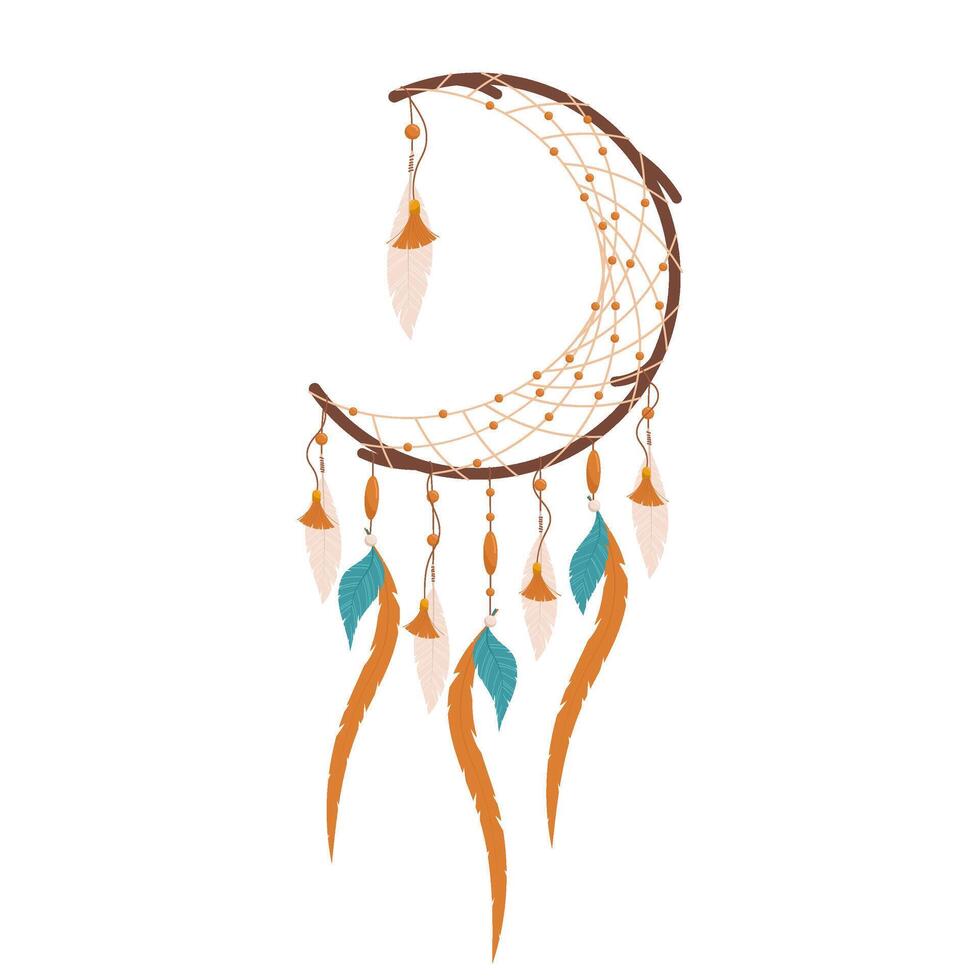 Dream catcher in boho style in the form of a crescent moon with beads and feathers. Pro Vector