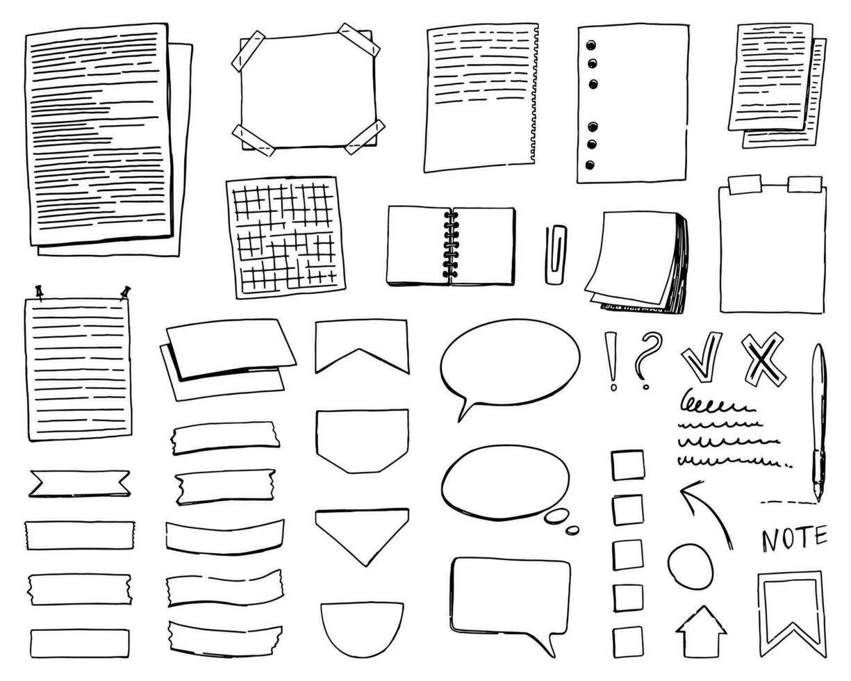 Set of cliparts for daily planning. Memo pages, speech bubbles, check marks, bookmark stickers, paper blanks template in doodle style. Hand drawn vector elements isolated on white. Pro Vector