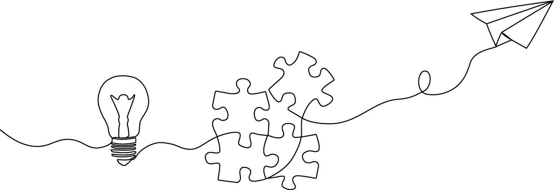 A flying paper airplane, puzzles and a light bulb connected in one continuous line. Pro Vector