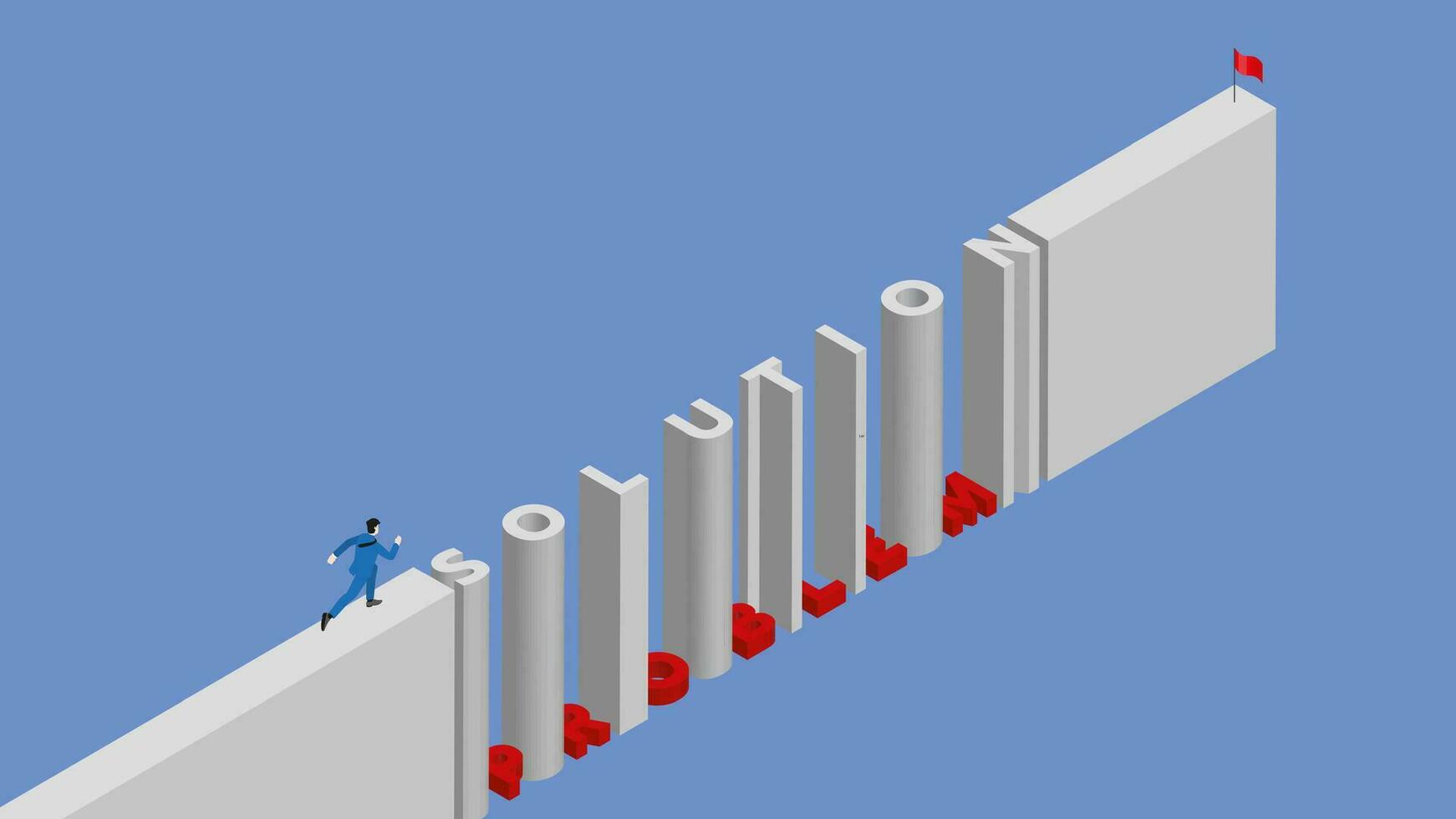 Businessman runs on step text SOLUTION alternate with red trap obstacle word PROBLEM Pro Vector