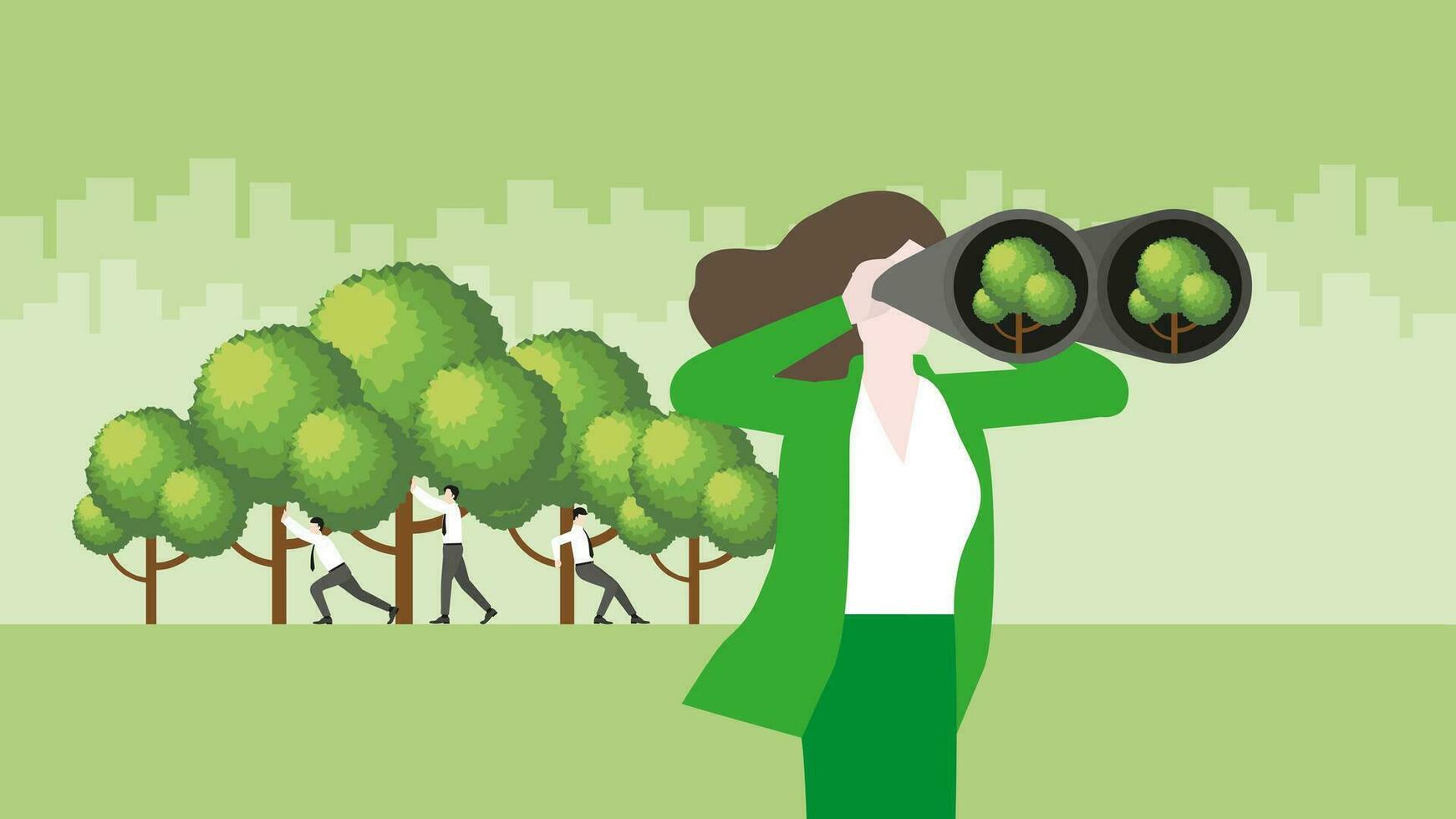 A businesswoman uses binoculars to find a tree with teamwork support. Pro Vector