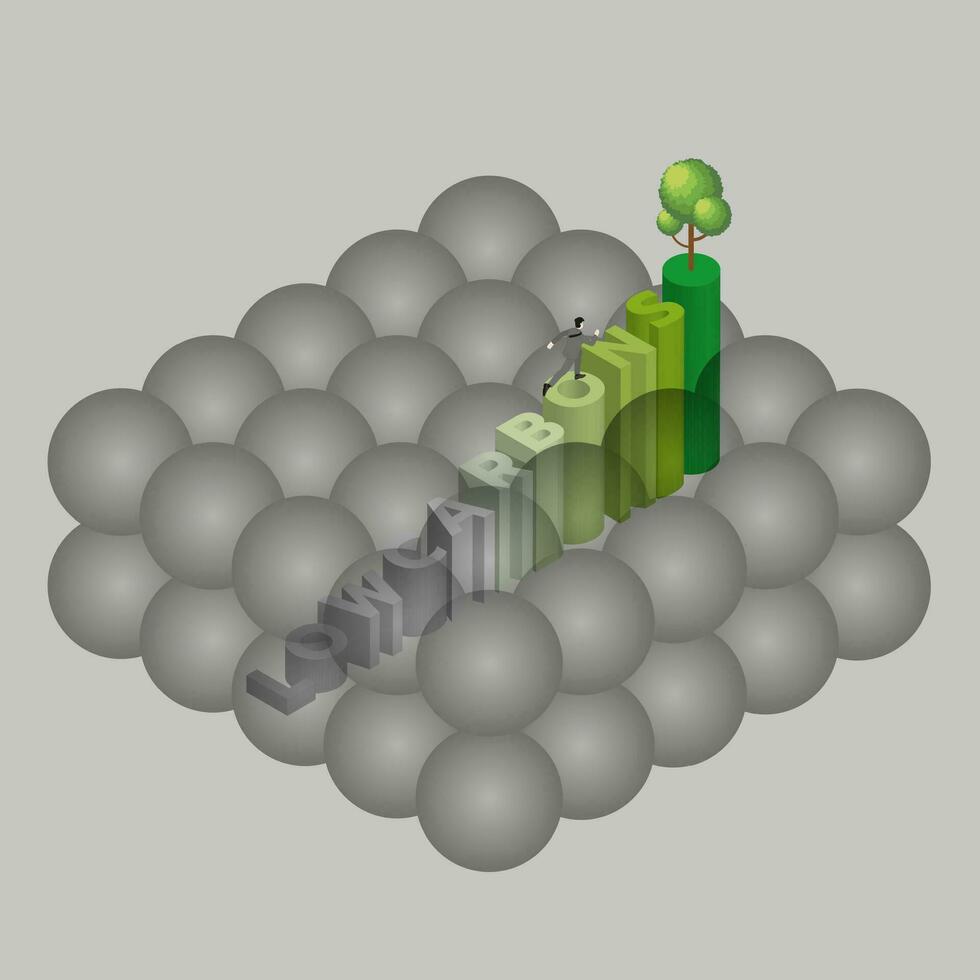 Air pollution and environmental concern concept. A man runs away from a cloud of smoke to a tree on top of text step vector