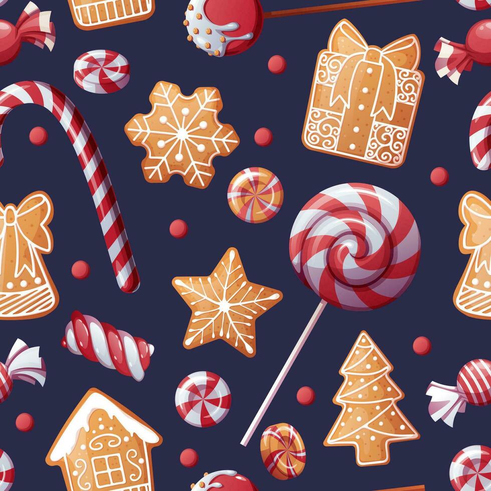 Seamless pattern with lollipops, candies and gingerbread cookies. Suitable for fabric, wrapping paper, wallpaper, background, textile, etc. Pro Vector