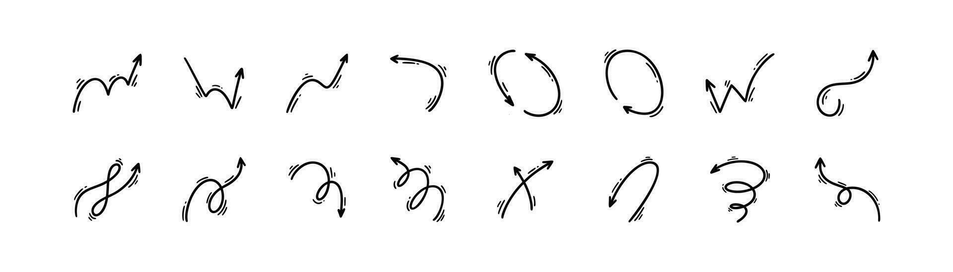 Hand drawn doodle arrows set. Sketch line icons. Direction pointers. Scribble, misdirection, twist, swish, swirl, loop, swoosh design elements Pro Vector