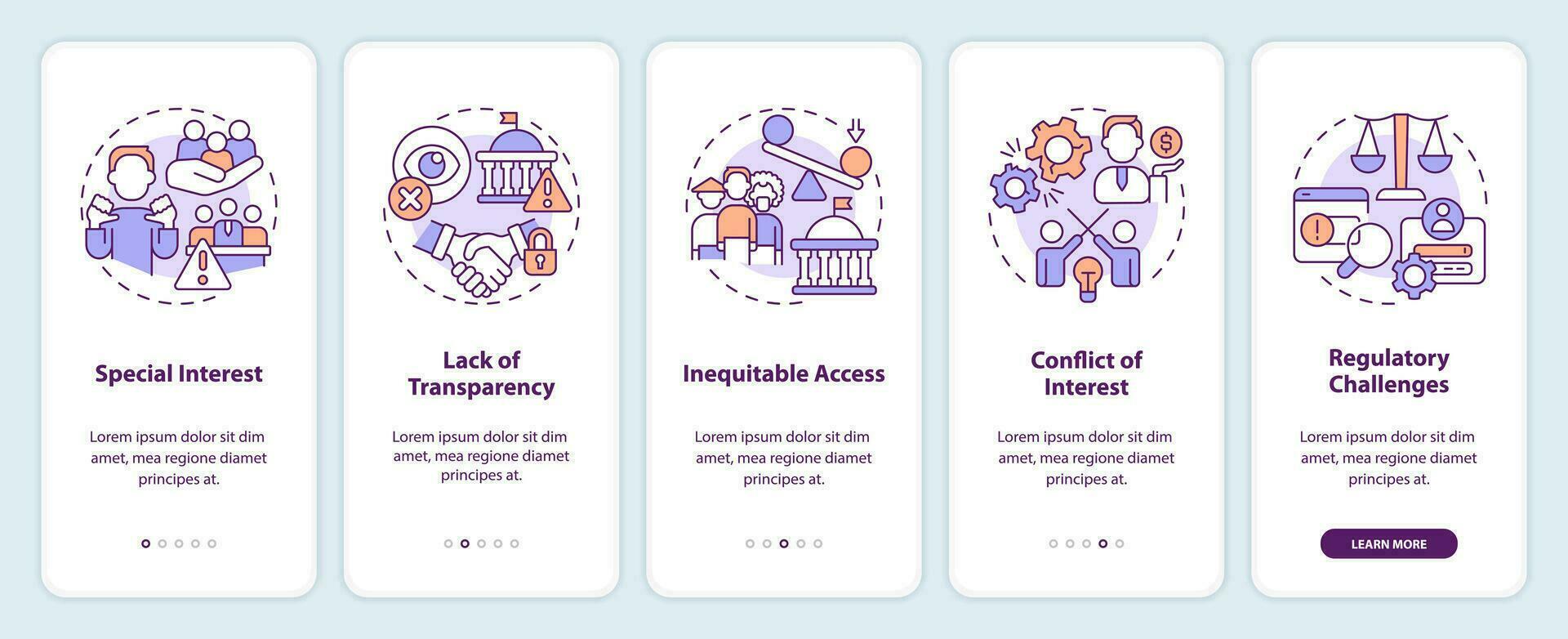 2D linear icons representing lobbying government mobile app screen set. 5 steps graphic instructions, UI, UX, GUI template. Pro Vector