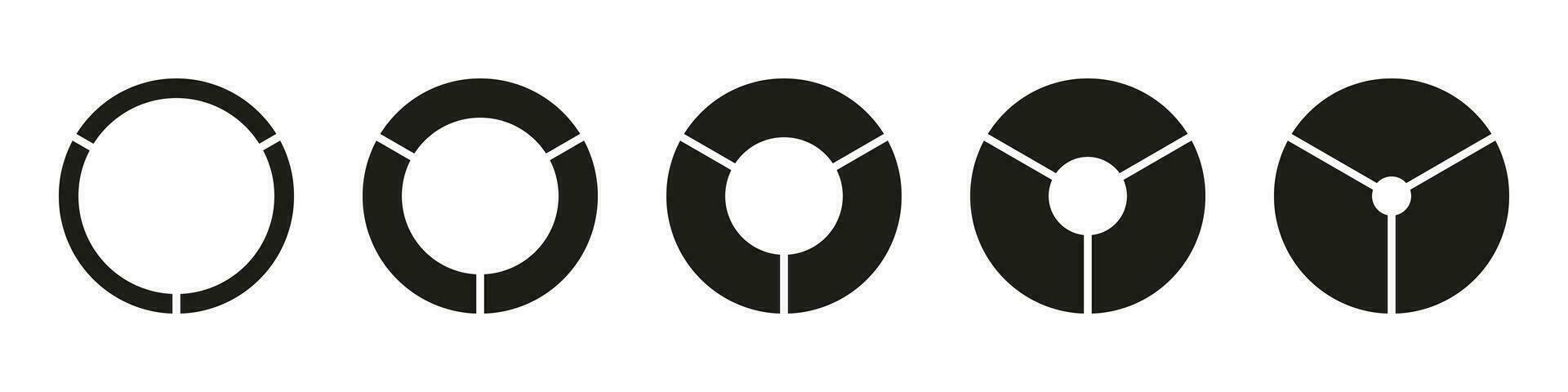 Circle section graphs. Wheels round divided, three sections. Diagrams infographic set. Pie chart icons. Donut charts or pies segmented on 3 equal parts. Geometric elements. Vector simple illustration. Pro Vector