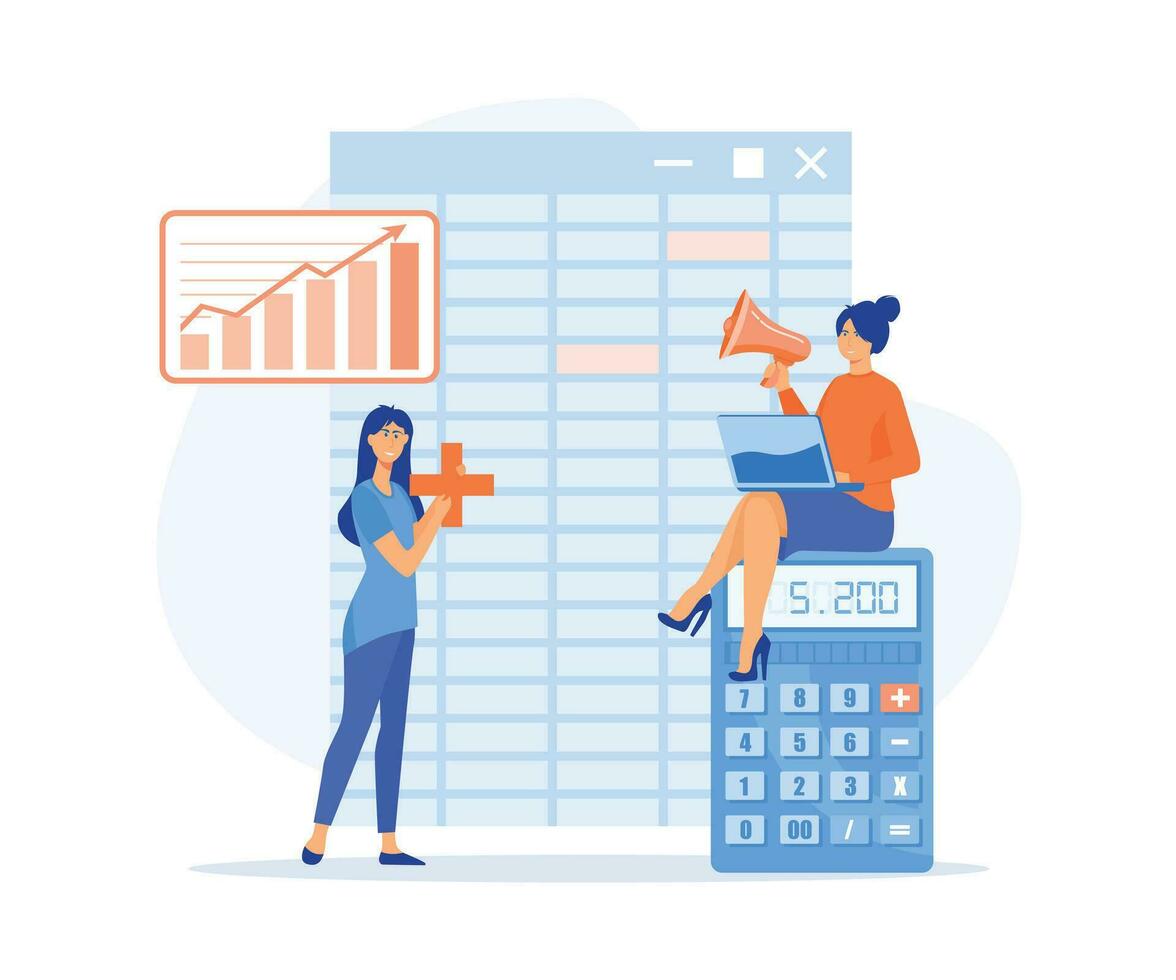 company bookkeeping report by accountants, Software for accounting with sheet, formula, calculators. make balance sheet easier with software. flat vector modern illustration Pro Vector