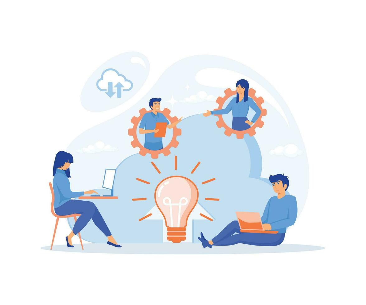 Co working team of users connected by cloud computing and light bulb. Online collaboration, flat vector modern illustration Pro Vector