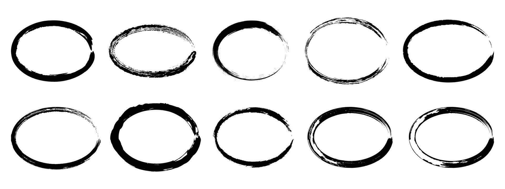 Set of ellipse frames form, grunge design elements with distress texture. Black brush stroke. Vector illustration isolated on white background. Pro Vector