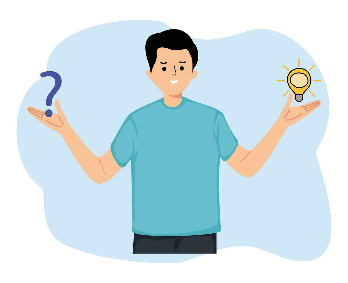 portrait man holding question symbol and light bulb symbol. question and answer q and a or solution to solve problem Pro Vector