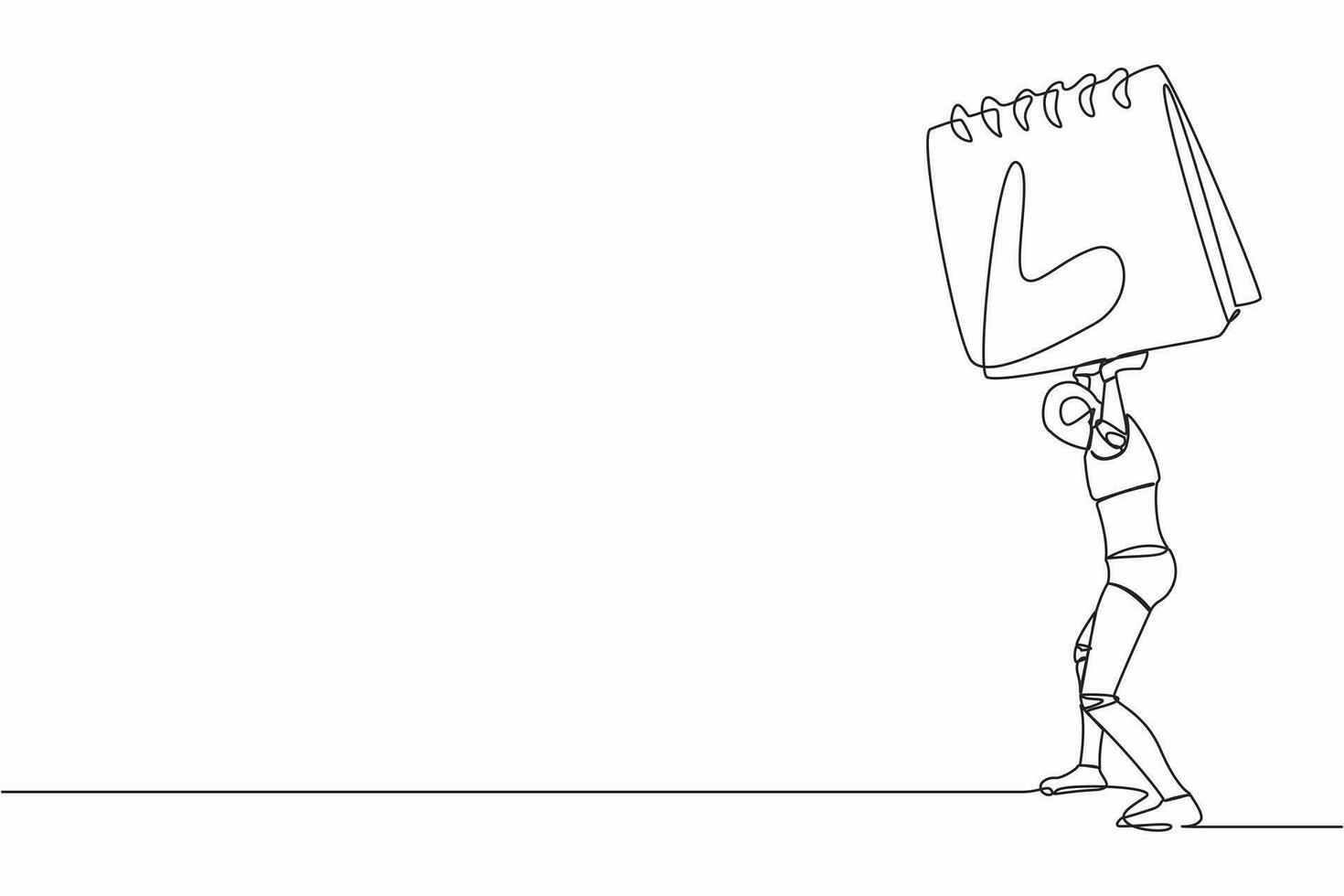 Single one line drawing tired robot carrying heavy calendar on his back. Cyborg with work problem and deadline. Humanoid robot cybernetic organism. Continuous line graphic design vector illustration Pro Vector