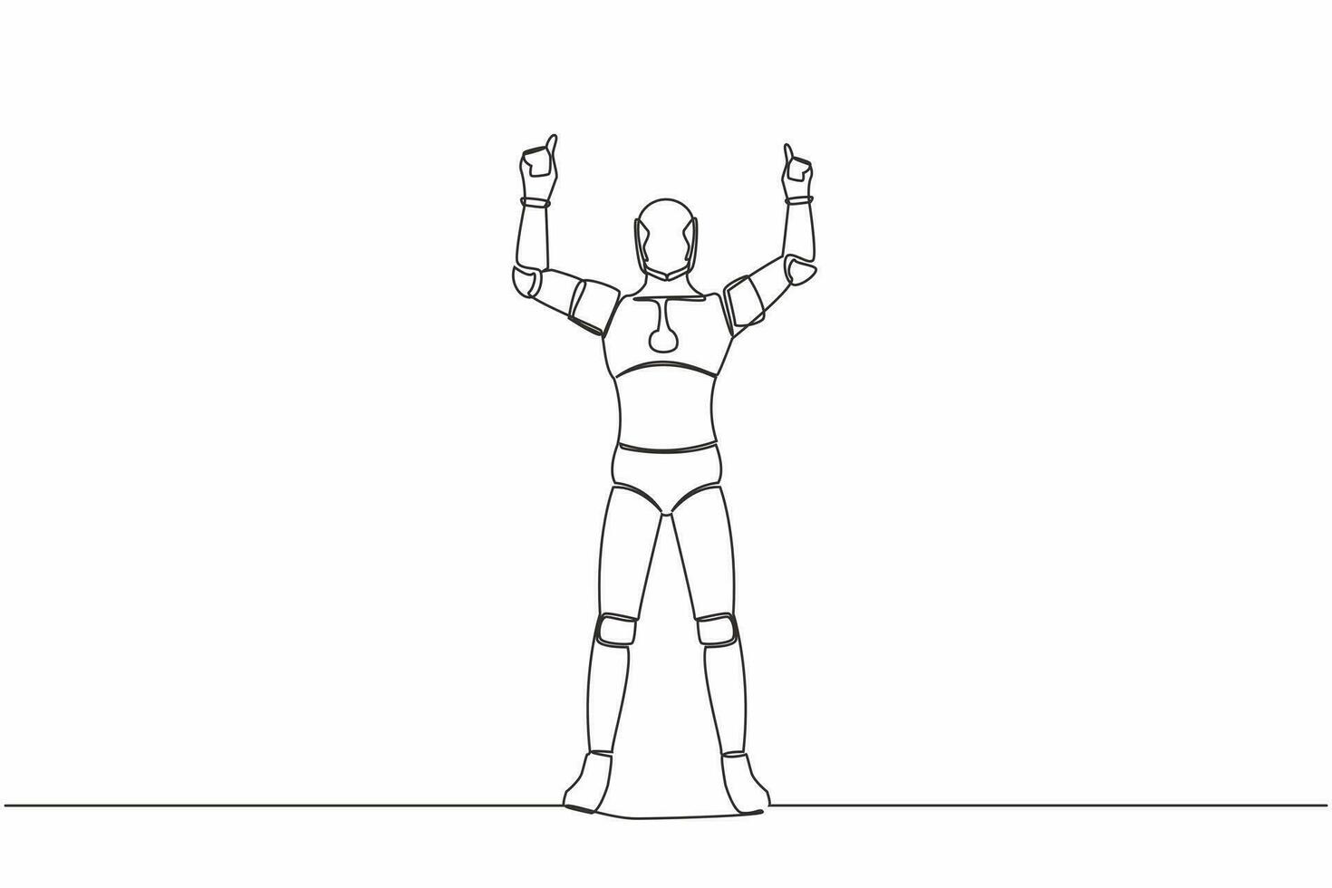 Single continuous line happy robot standing with both hands pointing index fingers up. Celebrate win. Artificial intelligence machine learning process. One line draw design vector graphic illustration Pro Vector