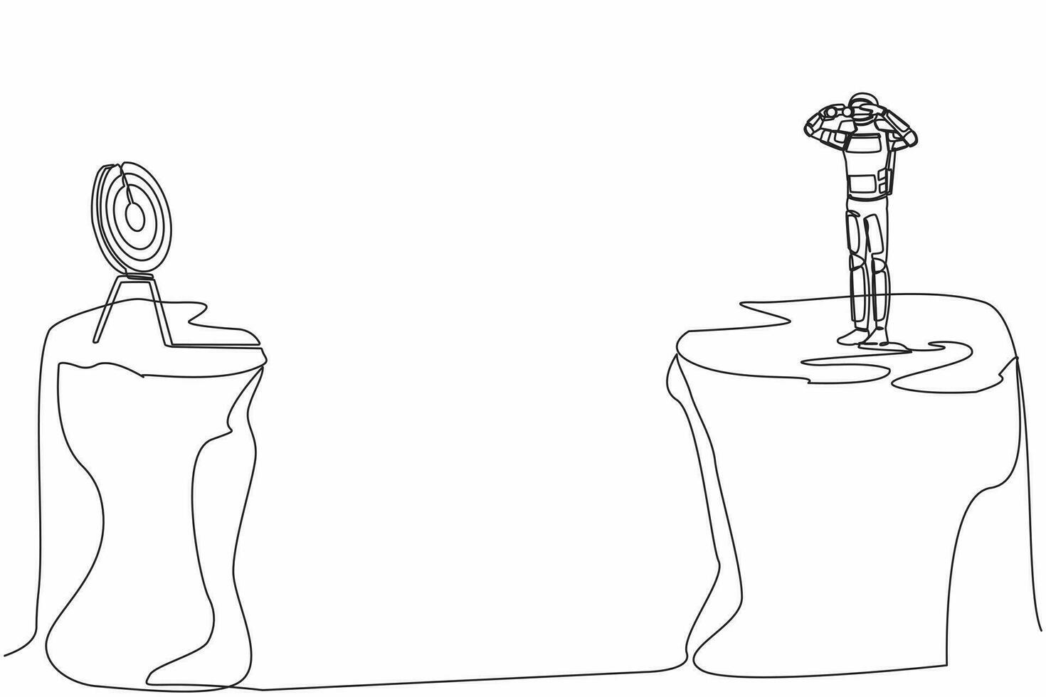 Continuous one line draw astronaut standing on cliff with binoculars looking for target on another cliff. Focus in spaceship innovation. Cosmonaut outer space. Single line design vector illustration Pro Vector