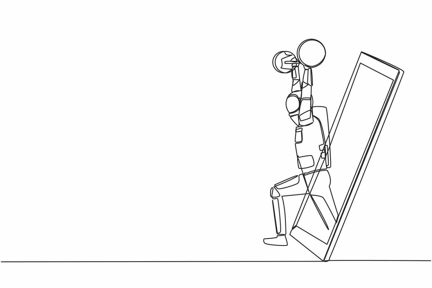 Continuous one line drawing bodybuilder astronaut doing exercise with heavy weight bar getting out of smartphone screen. Online weight lifting. Cosmonaut outer space. Single line graphic design vector Pro Vector