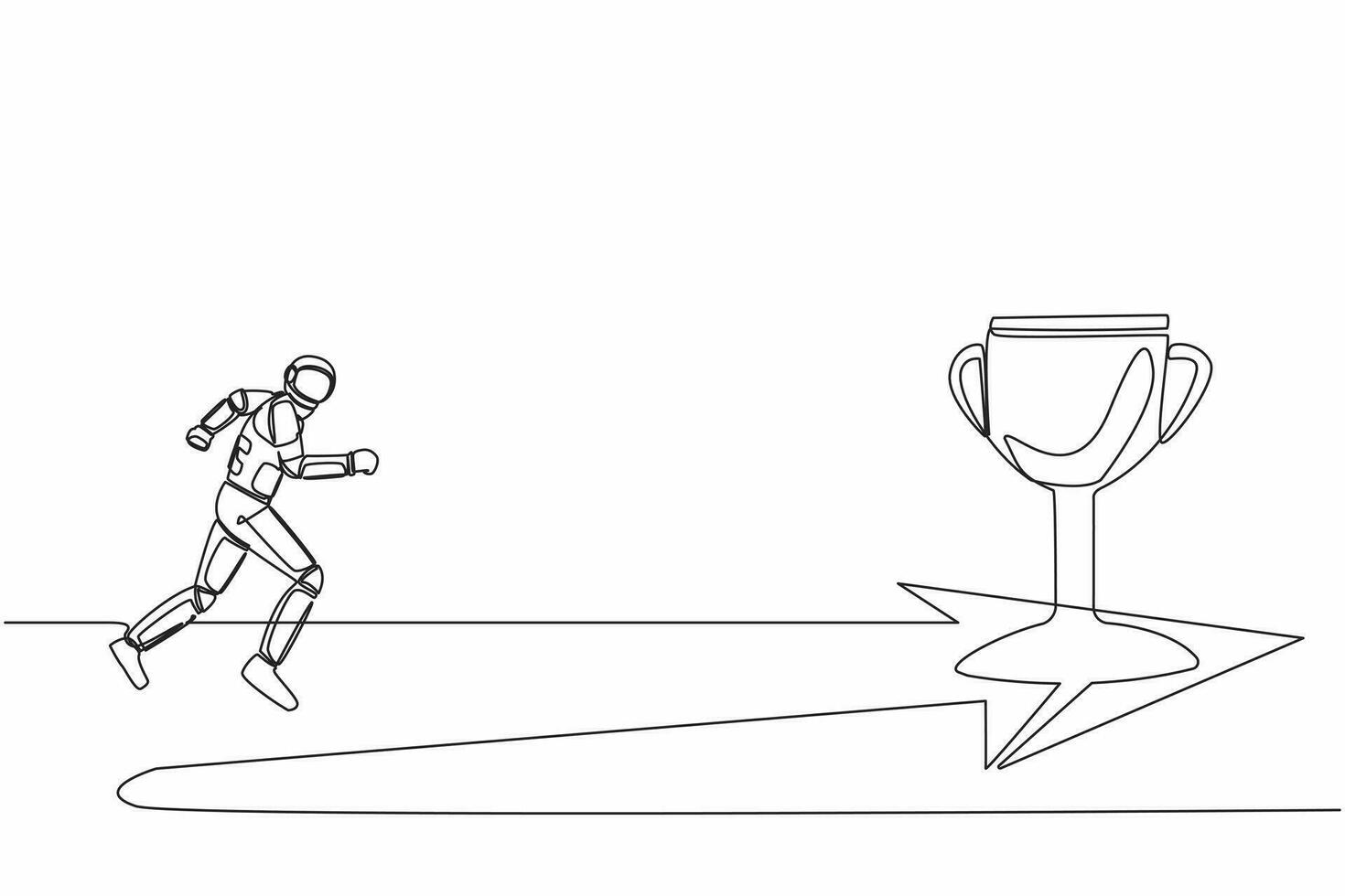 Continuous one line drawing astronaut running to reach golden trophy. Space scientist direction to get intellectual purpose. Cosmonaut outer space. Single line draw graphic design vector illustration Pro Vector