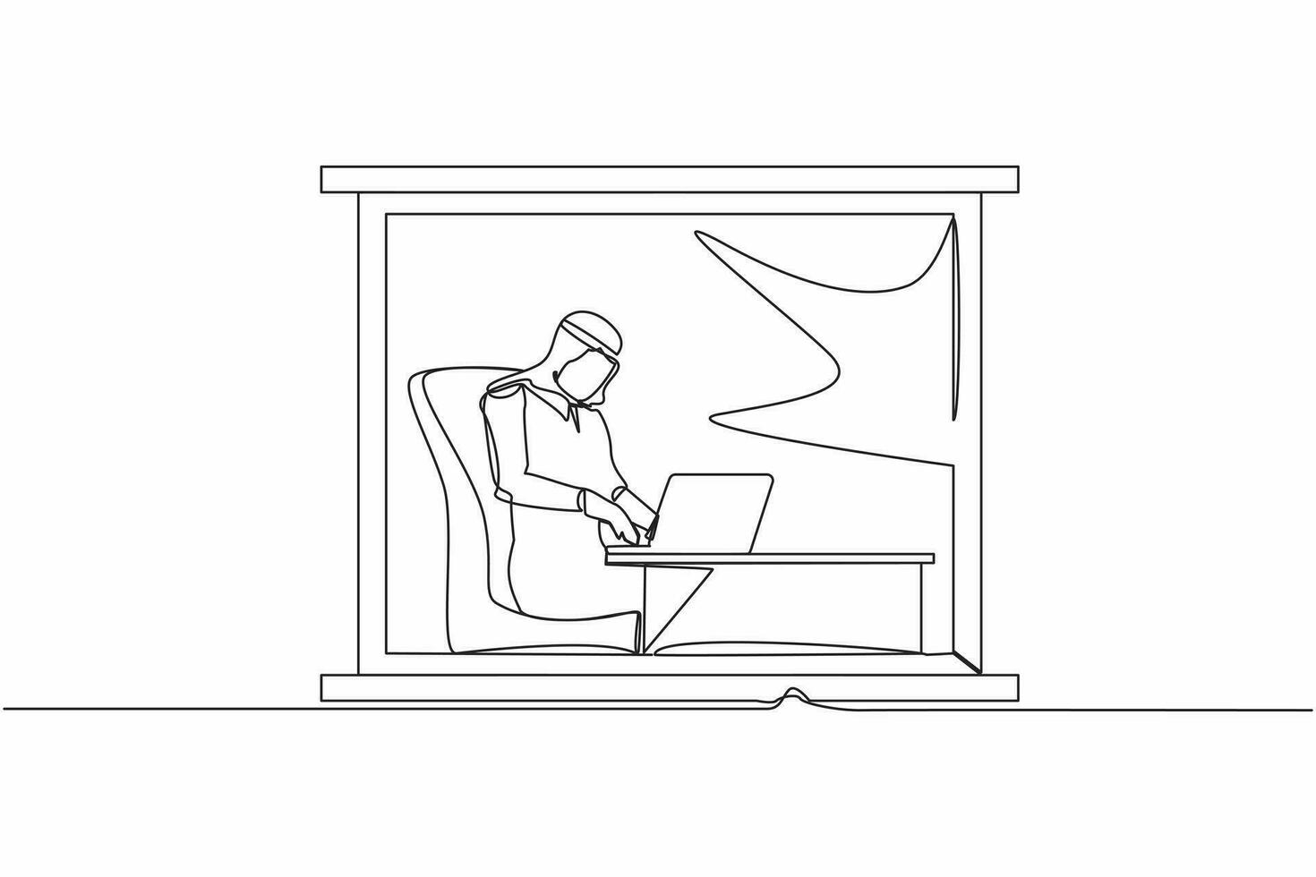Single continuous line drawing Arab man working from home near window. Businessman sitting at desk and using laptop. Project management. Remote work or home office. One line draw graphic design vector Pro Vector