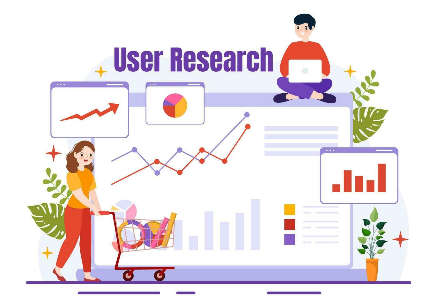 User Research Vector Illustration of People Searching and Exploring in Networks to Design Project, Online Survey and Analytics in Flat Background Pro Vector