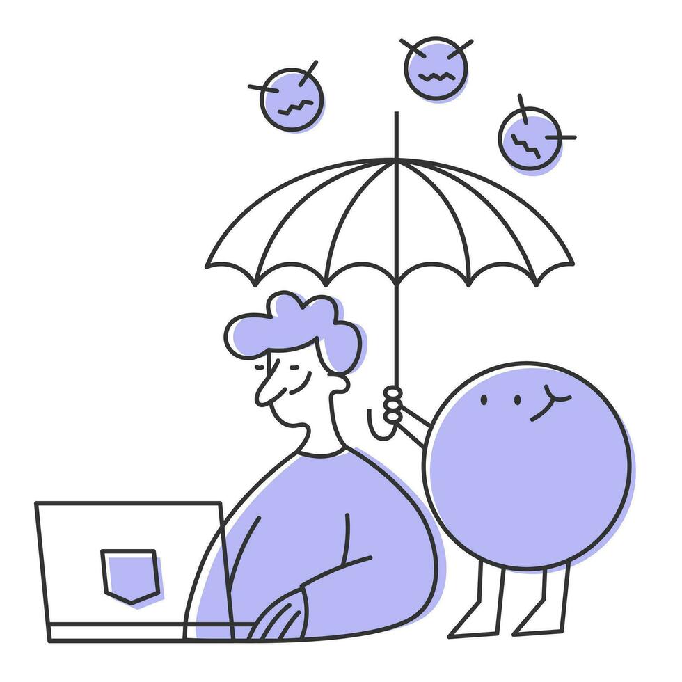 Data access and cybersecurity, network encryption, a man with a laptop uses an antivirus program. An abstract program protects a person from viruses Pro Vector
