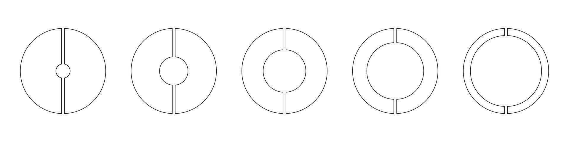 Coaching wheels round divided in two sections. Diagrams infographic set. Circle section graphs. Pie chart icons. Donut charts or pies segmented on 2 equal parts. Geometric vector element. Life blank. Pro Vector