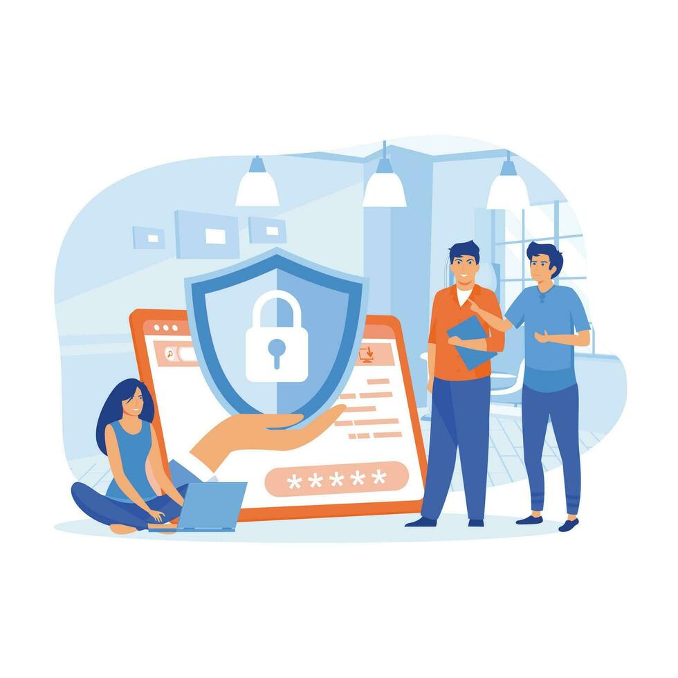 Data security. People and computer with shield and lock. flat vector modern illustration Pro Vector