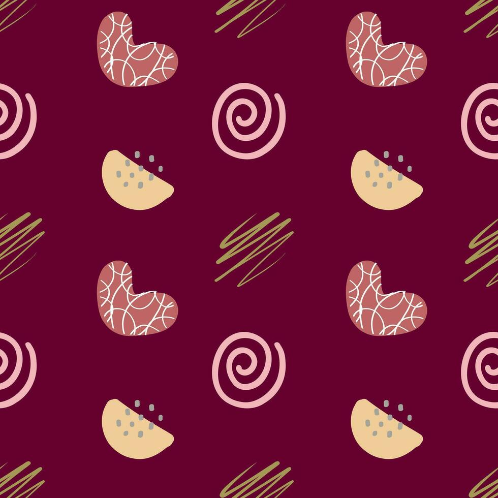 Seamless Pattern with abstract boho elements swirl, blob, heart. Various shapes isolated on dark background. Warm boho element. Pro Vector