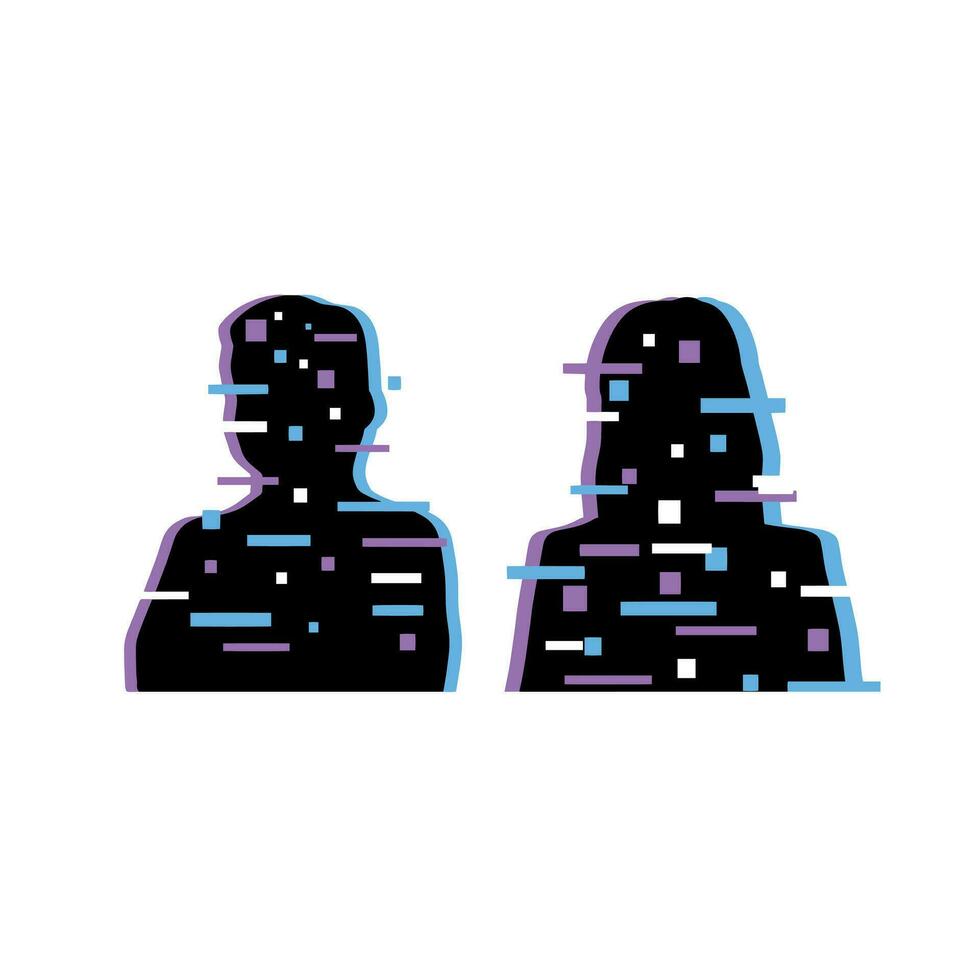 Distorted Glitch Avatar. Digital Silhouette of people. Retro glow VHS effect Human. Cyber profile of computer user. Anonymous hacker avatar isolated on white background Pro Vector