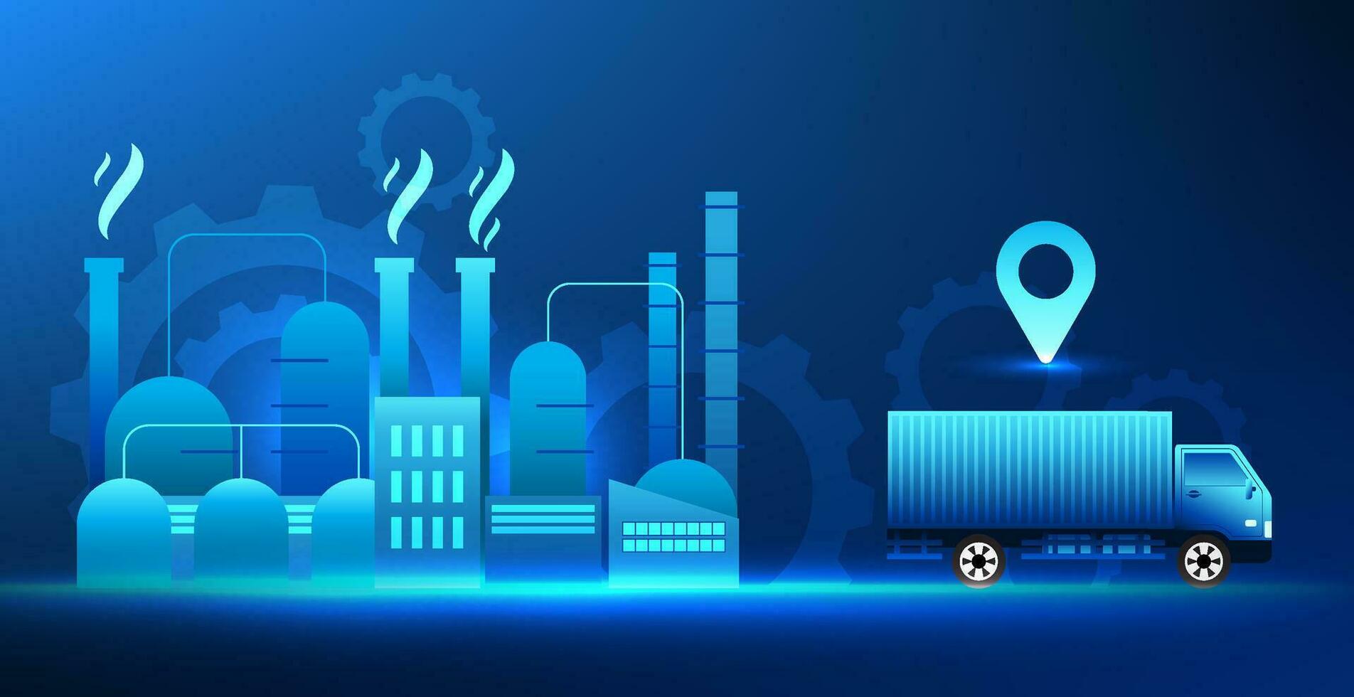 Transportation and logistics business technology Container truck is picking up goods from the factory. By using technology to help manage transportation and also using artificial intelligence. Pro Vector