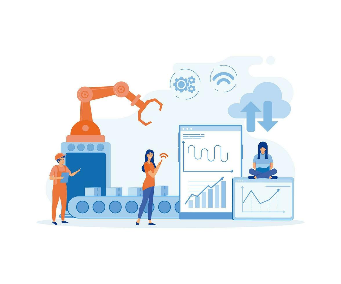 Smart Factory and working person using wireless technology to control, workflow With clever device. infographic of industry 4.0, flat vector modern illustration Pro Vector