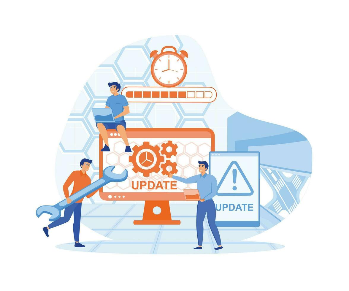 IT specialists updating software, programs and applications.flat vector modern illustration Pro Vector