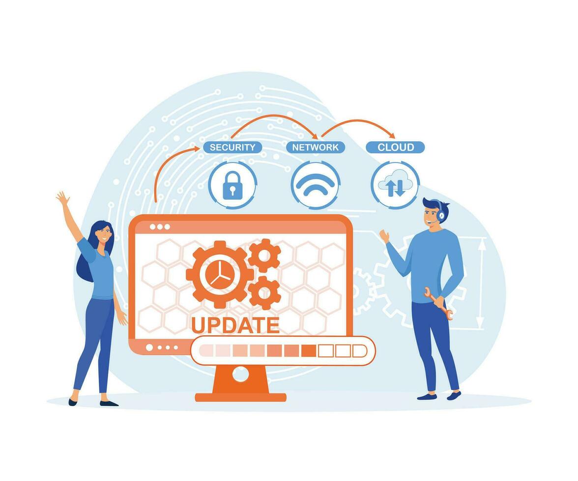 The application and web development team ensures the system updates regularly over time. flat vector modern illustration Pro Vector