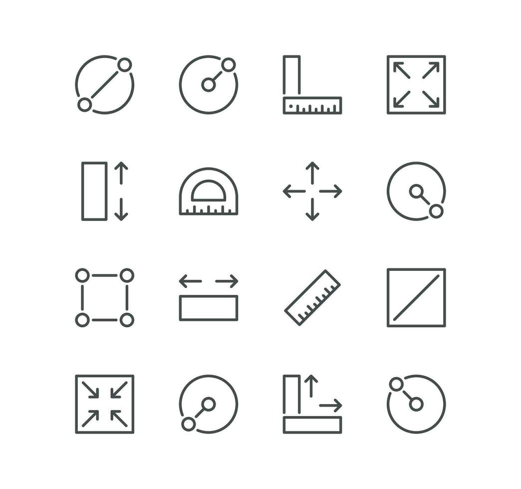 Set of measure related icons, resize, radius, depth, area, diameter and linear variety vectors. Pro Vector