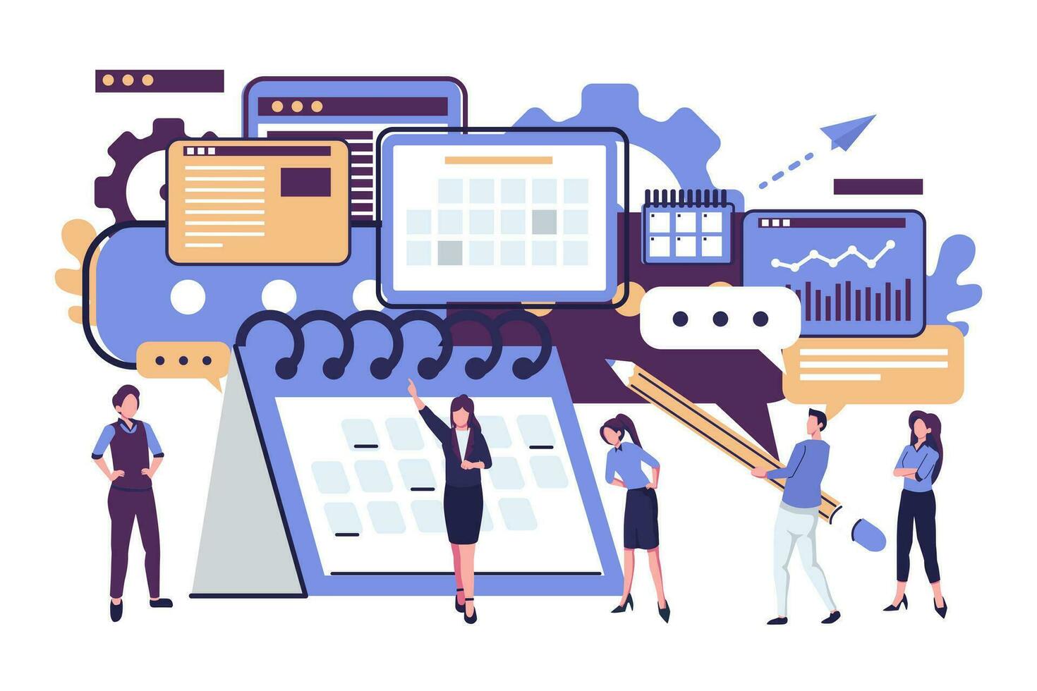people are making schedule for project, business graphics tasks scheduling on a week flat illustration Pro Vector