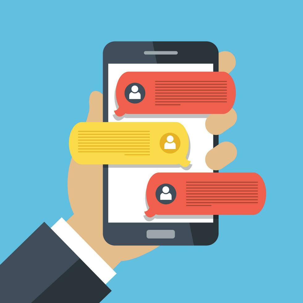 Hand holding smart phone and chatting bubble speeches. Mobile phone with chat message notifications. Concept of on line talking, speak, conversation and dialog. Flat vector illustration