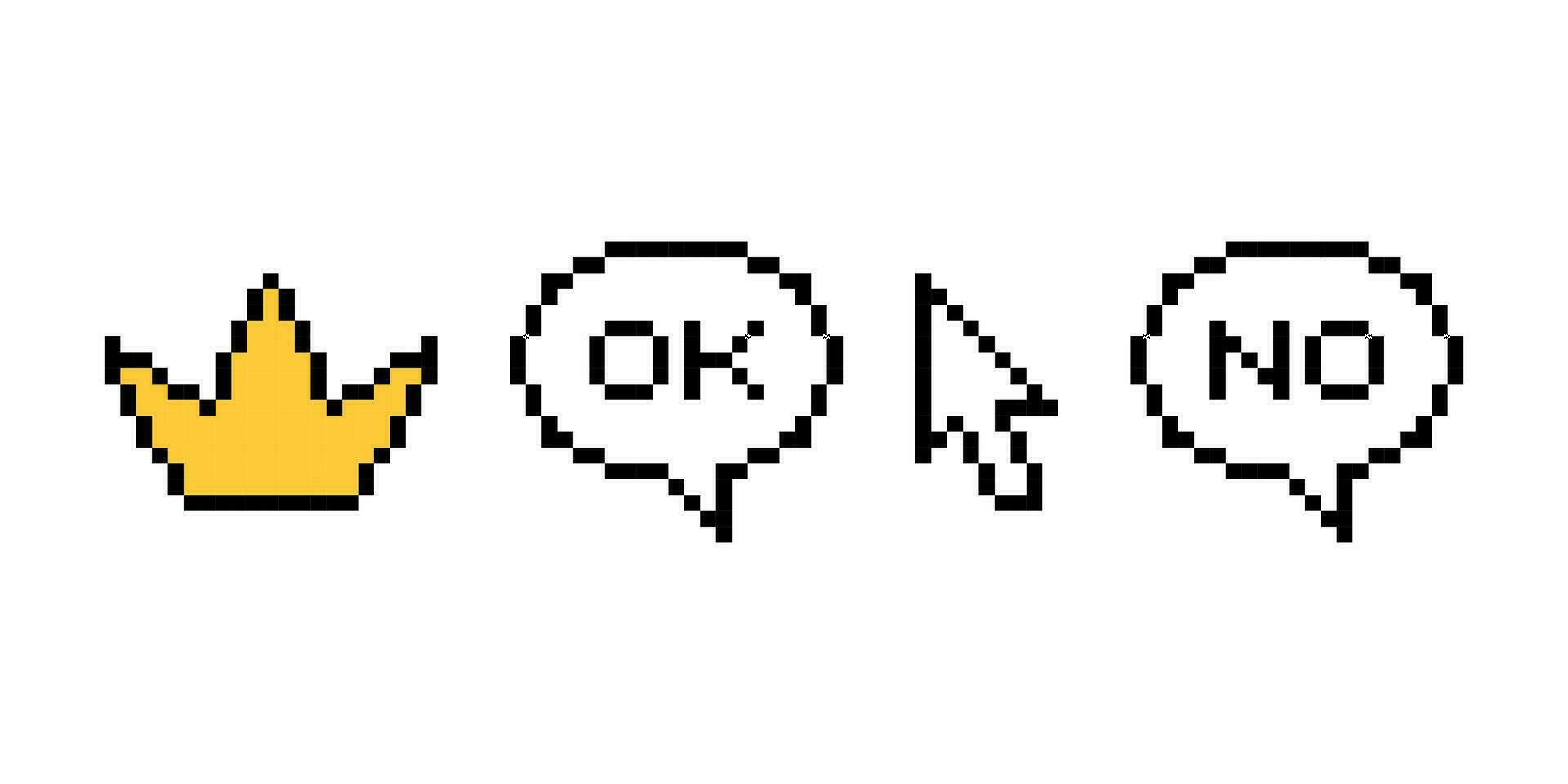 Clipart set of pixel elements in 8-bit style isolated on a white background. Crown, pointer and floating dialog box icons with captions. Pro Vector