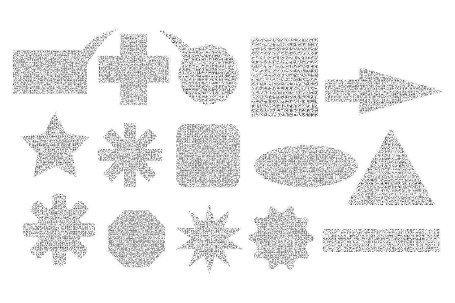 Set of different symbols and signs made of sand texture. Geometric shapes and icons with grainy noise effect. Grunge star, cross, heart, arrow, square, rectangle, triangle, oval, speech bubble. Vector Pro Vector
