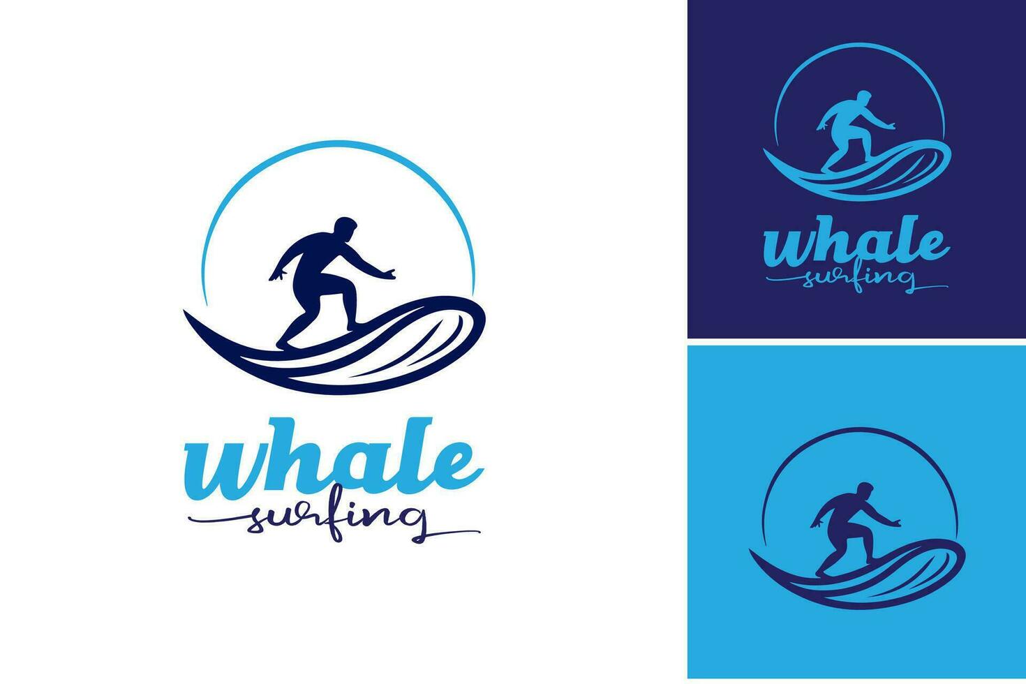Whale Surfing logo design template. A dynamic and playful design showcasing a man riding a wave while a whimsical whale surfs alongside. Perfect for surf-related graphics, beach-themed merchandise Pro Vector