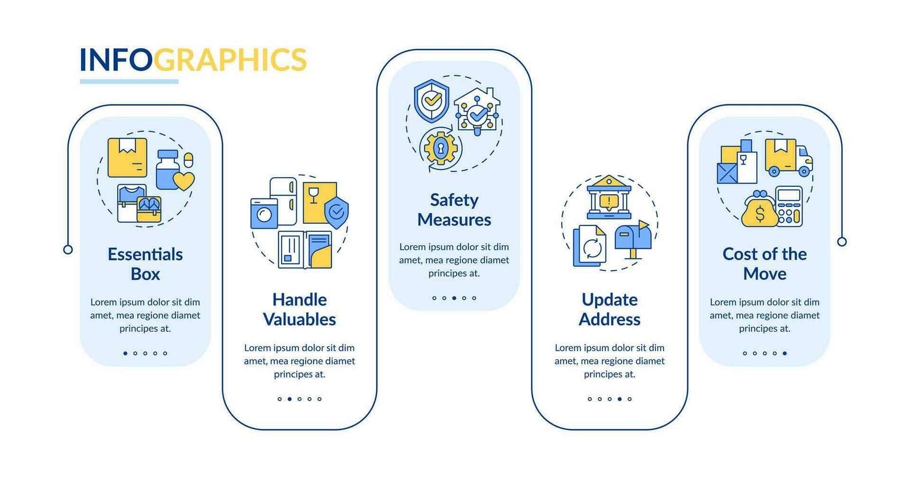 2D moving service vector infographics template with linear icons concept, data visualization with 5 steps, process timeline chart. Pro Vector