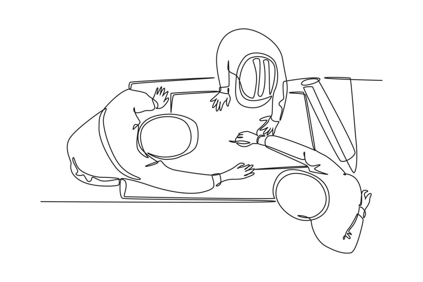 Single one line drawing top view of young architect and construction builder discussing blueprint building design. Home architecture concept. Continuous line draw design graphic vector illustration Pro Vector