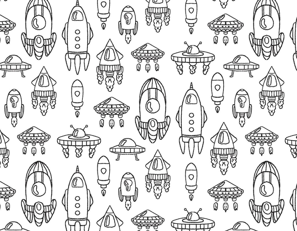 transport to space pattern on a transparent background, doodle style, space adventure, children's print. Vector graphics for packaging and testing design Pro Vector
