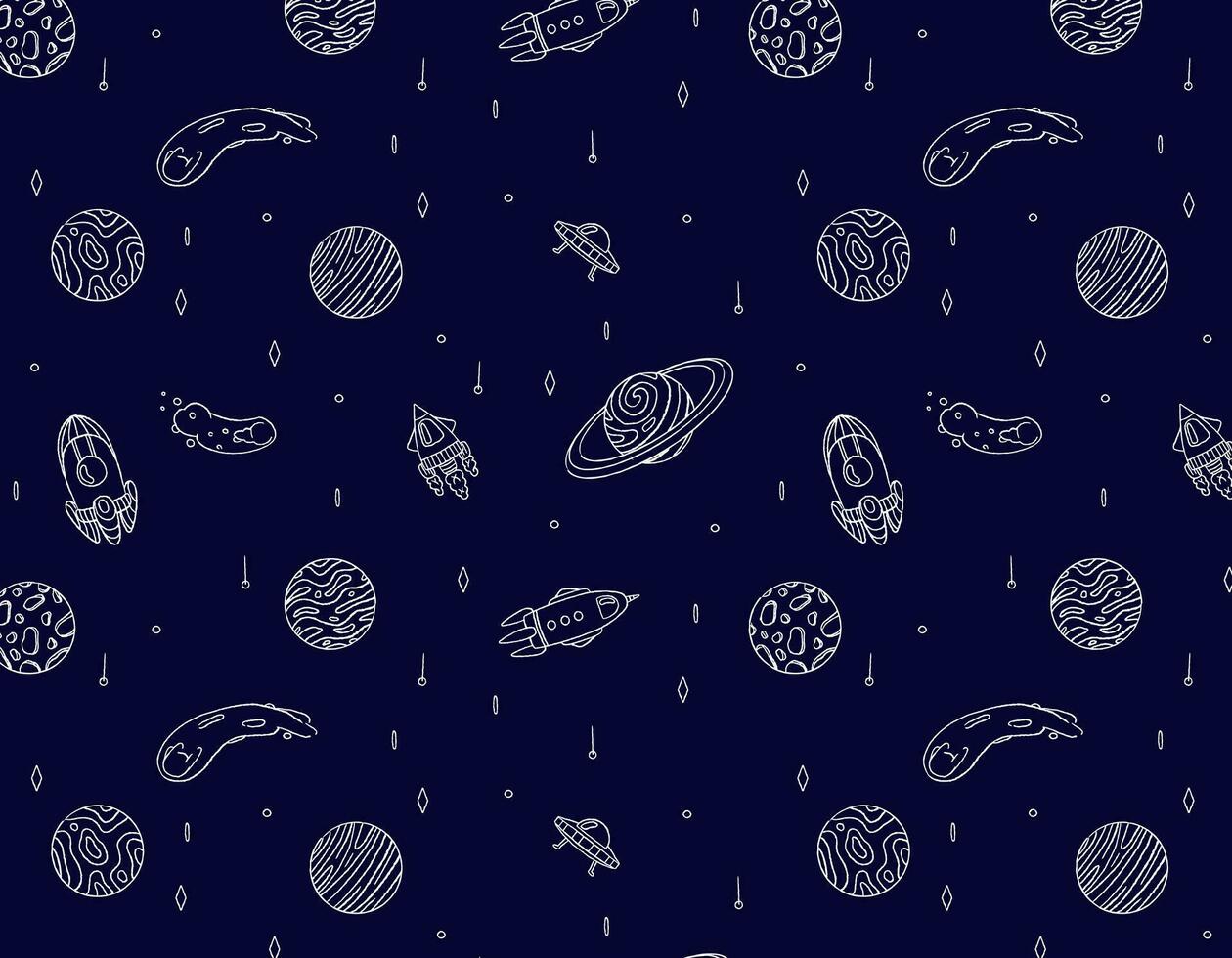 pattern of planets and rockets into space on a blue background, doodle style, space adventure, children's print. Vector graphics for packaging and testing design Pro Vector