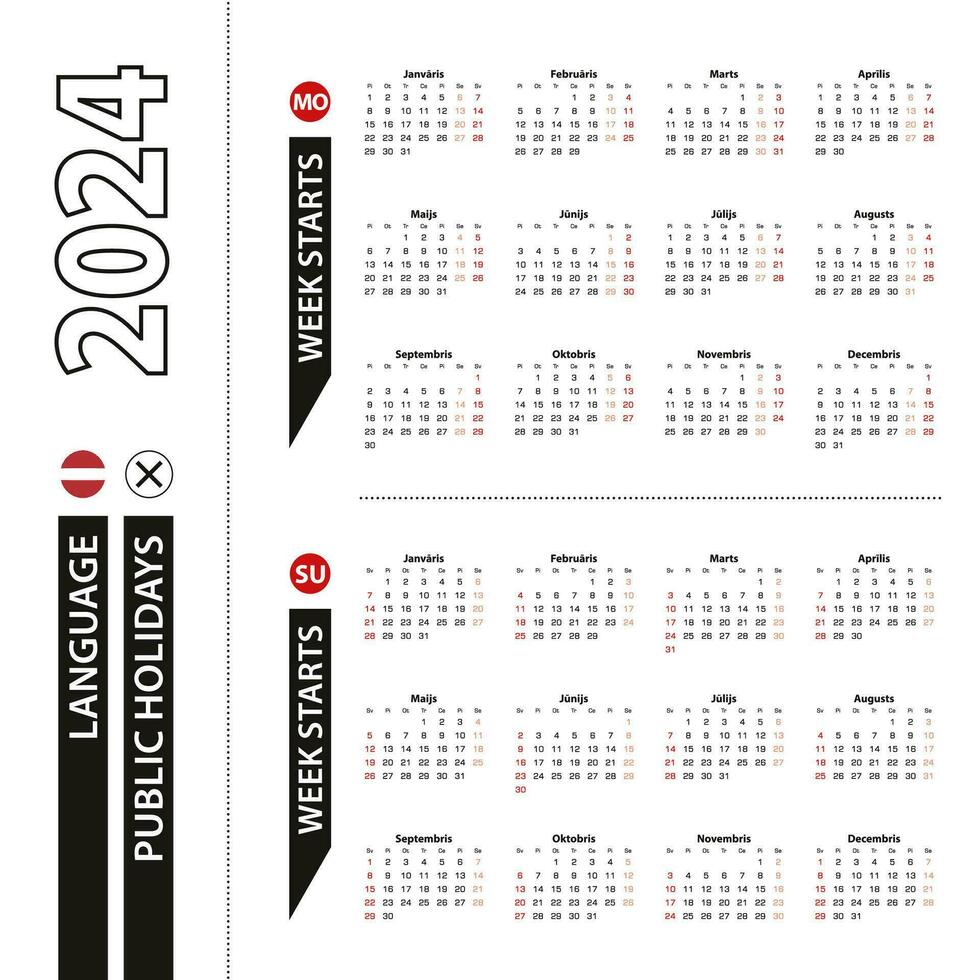 Two versions of 2024 calendar in Latvian, week starts from Monday and week starts from Sunday. Pro Vector