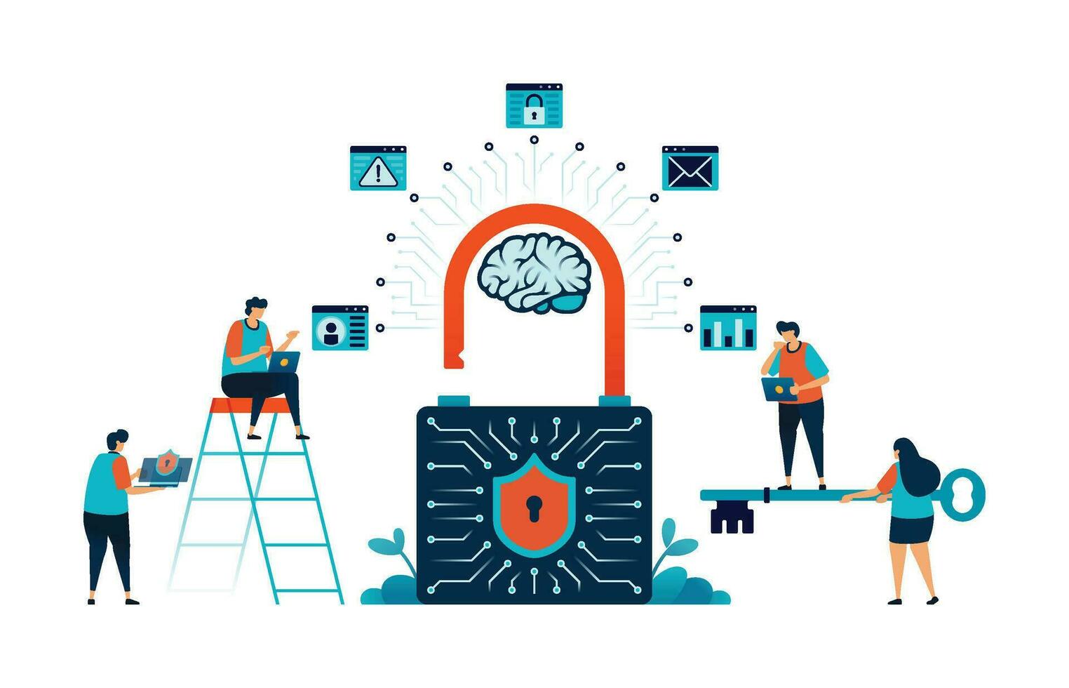 Artificial intelligence illustration of security, protection and defense with AI on network data communication. warning alert with AI technology. Can be used for mobile app website web flyer poster ad Pro Vector